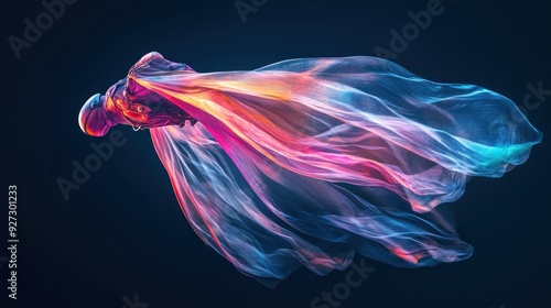 A person in a red space suit with a glowing helmet wearing a sheer fabric that is flowing in the wind.