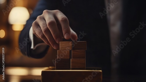 A person in a suit carefully stacks wooden blocks in a balancing game