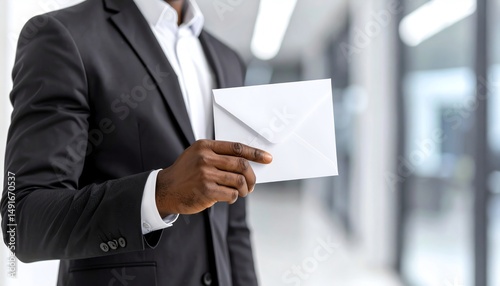 A person in a suit holds a white envelope, standing in a modern office environment with blurred backgrounds