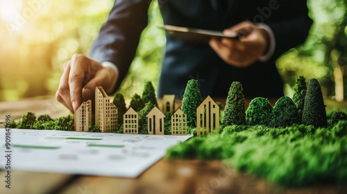 A person in a suit signs a document on the ground with a small plant growing from it, symbolizing eco-friendly business practices.
