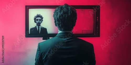 A person in a suit watches a puppet-like figure on an old television screen, illustrating the concept of mass media control