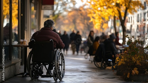 A person in a wheelchair enjoys a lively autumn street scene filled with people and foliage.
