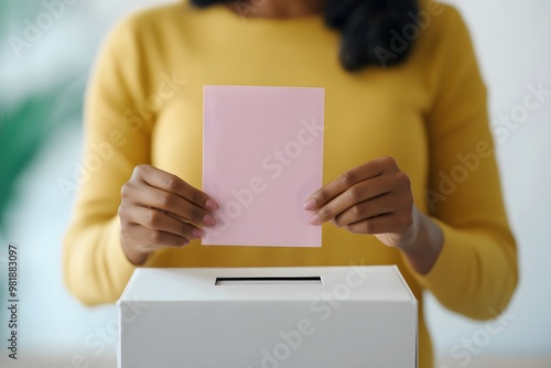 A person in a yellow sweater is placing a pink ballot into a white voting box, representing participation in an election.