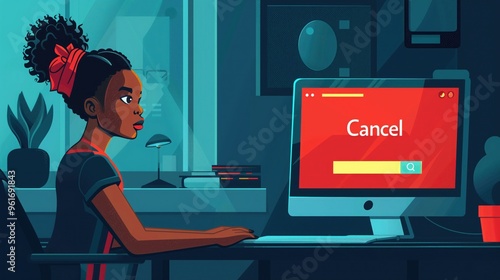 A person in front of a computer screen, hesitating to click a large red "Cancel" button