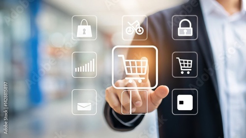 A person interacting with digital shopping icons, highlighting e-commerce and online shopping features in a modern environment.