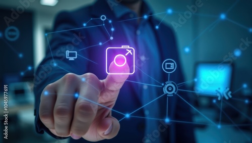 A person interacts with a futuristic digital interface, engaging with smart technology icons connected by glowing lines.