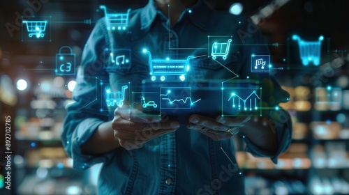 A person interacts with digital shopping icons on a tablet, symbolizing modern online commerce and technological advancement.
