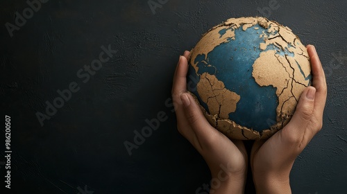A person is holding a broken globe in their hands. The globe is cracked and he is damaged. Concept of fragility and vulnerability, as if the globe is a symbol of the world and its delicate state