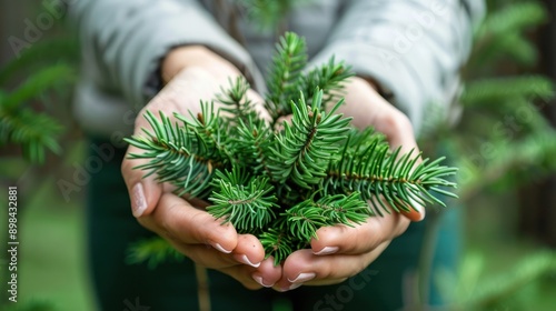 A person is holding a bunch of small and green plants, pine tree branches in their hands. . Concept of Saving the planet, environment, save the world, Earth day concept telephoto lens
