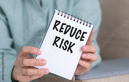 A person is holding a spiral bound notebook with the word Reduce Risk written