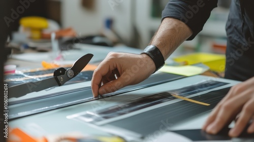 A person is meticulously arranging photographs on a table, utilizing cutting tools and tools for creative design and layout.