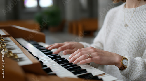A person is playing an organ keyboard indoors, wearing a light sweater and a wristwatch, with soft natural light in the background.