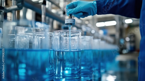 A person is pouring liquid into a blue glass