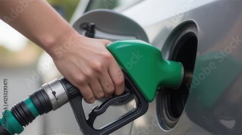 A person is refueling a vehicle at a gas station, holding a green gas pump nozzle while filling the tank.
