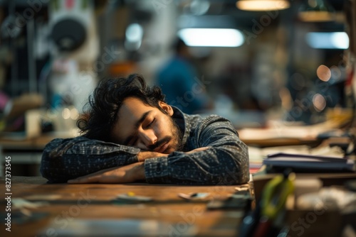 A person is seen resting their head on a workbench with blurred background suggesting a workshop setting, implying tiredness or a break