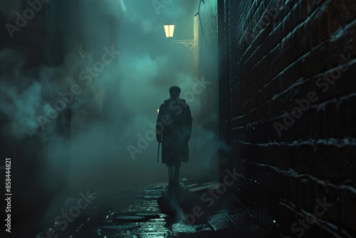 A person is seen walking down a dark and deserted alleyway, providing a sense of mystery and intrigue