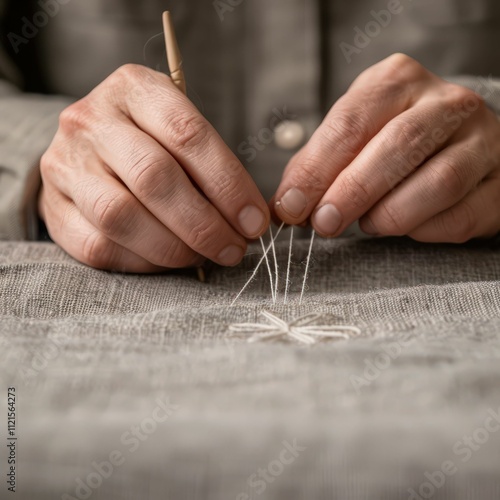 A person is skillfully embroidering delicate patterns on linen fabric, showcasing intricate handwork and craftsmanship.