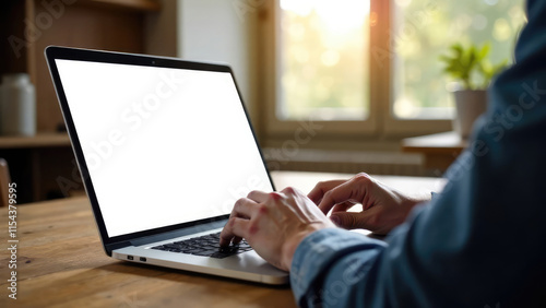 A person is typing on a laptop with a blank screen on a wooden table. Concept of: online activity.