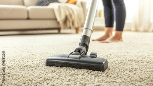A person is vacuuming a carpeted floor in a cozy living room, showcasing a clean and tidy environment.
