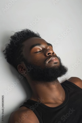 A person lying on a wall, wearing a beard