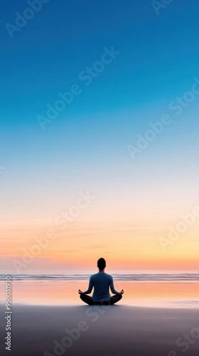A person meditating on a beach at sunrise, sitting in a cross-legged position with eyes closed, capturing a moment of peace and reflection