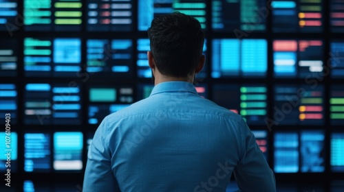 A person observes a vibrant wall of digital screens displaying various data, immersed in a high-tech environment.