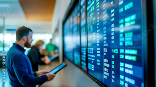 A person observes digital screens displaying information, likely in an airport or transportation hub, while holding a tablet.