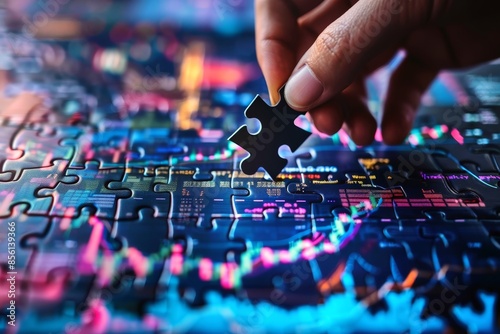 A person placing the final piece into a complex puzzle that reveals a stock market chart.