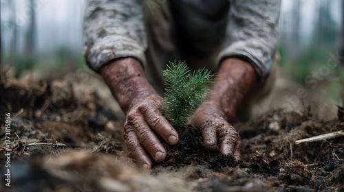 A person plants a young tree seedling in dark soil