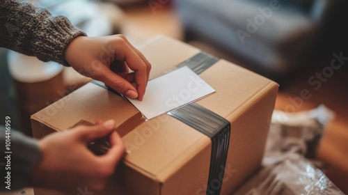 A person prepares a package for shipping, placing a blank card on a cardboard box.