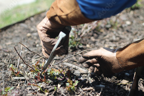 a person pruning around the base of a rose plant in Spring. horticulture design element or background