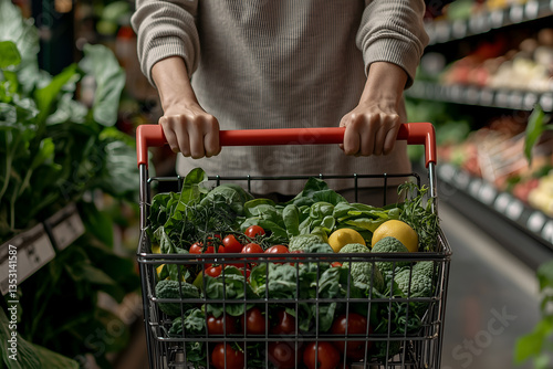 A person pushing a shopping cart through a supermarket aisle, mid-body shot, hands gripping the handle, filled with fresh produce, blurred shelves in the background