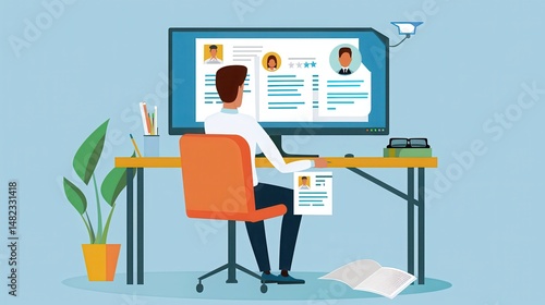 A person reviewing resumes on a computer screen in an office with a plant and desk lamp visible