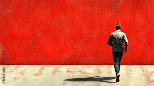A person running towards a vibrant red wall, symbolizing determination or escape.