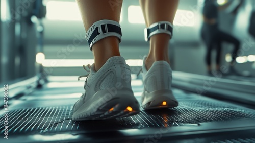 A person runs on a treadmill in a gym, showcasing white athletic shoes and fitness trackers on their ankles, emphasizing exercise and health.