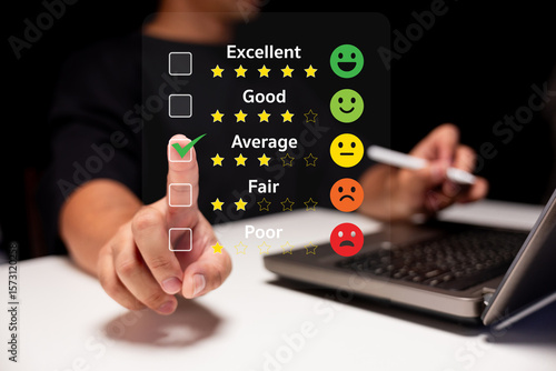 A person selects an "Average" rating on a digital feedback interface with star ratings and emoji faces, using a laptop and stylus pen in the background.