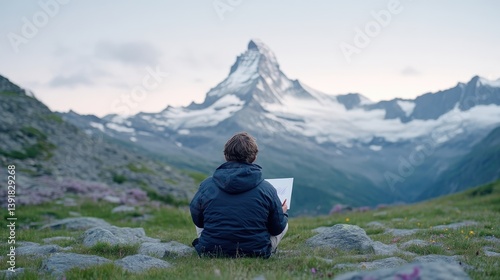 A person sits in a mountain meadow, sketching a majestic peak. Vast alpine scenery