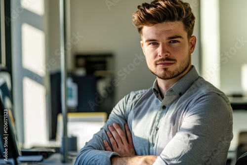 A person sitting at a desk with their arms crossed, focused on their laptop