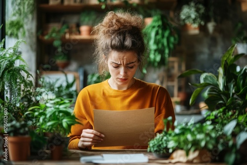 A person sitting in a coffee shop, staring at an unopened letter on the table with a worried expression