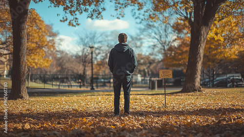 A person standing alone in an autumn park surrounded by colorful leaves on a sunny day