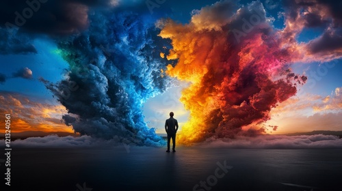 A person standing between two contrasting colorful clouds at sunset, symbolizing choice and emotion