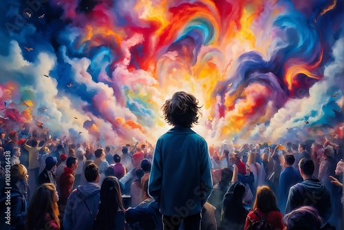 A Person Standing in a Bustling Crowd, Appearing Small and Overwhelmed with Swirling Thoughts