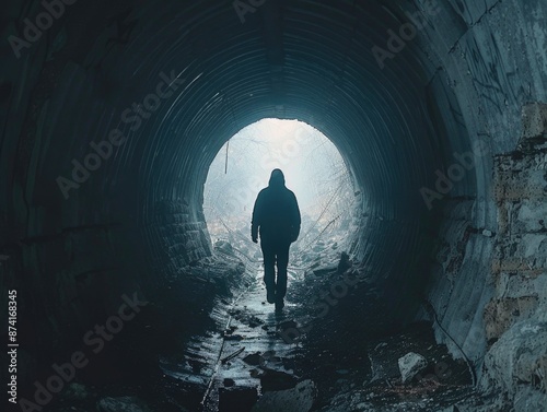 A person standing in a dark tunnel with a light at the end, great for representing uncertainty or hope