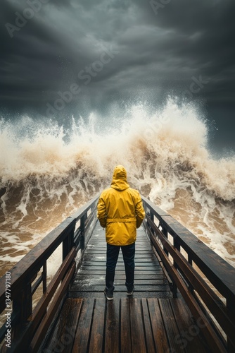 A person standing in front of giant sea tide wave. Water splashes. Dangerous. In a hurricane storm.