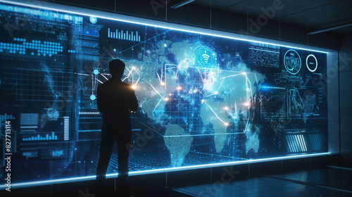 a person standing in futuristic digital data monitoring room, modern technology illustration