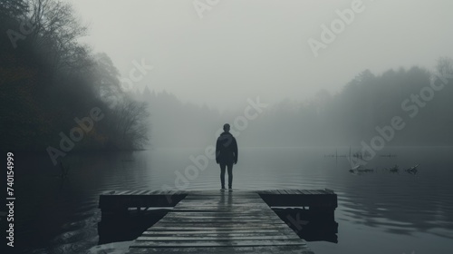 A person standing on a dock in the middle of a lake. Ideal for travel or relaxation concepts