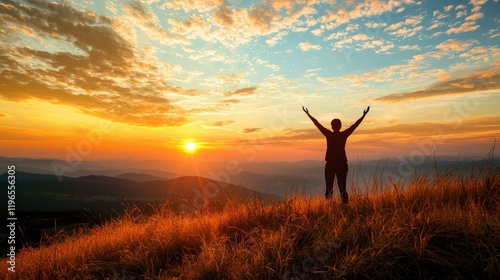 A person standing on a hilltop at sunrise, arms raised in hope and triumph.