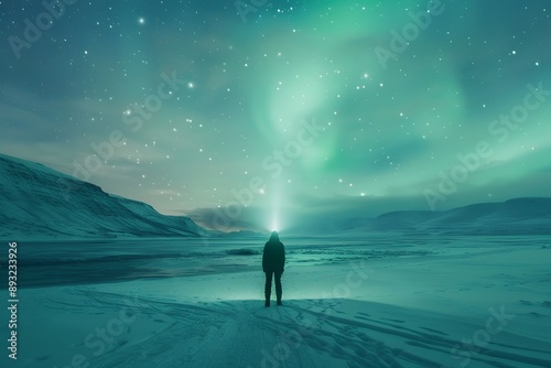 A person standing on the snow-covered ground, holding up their flashlight to create an aurora in the sky above them. The northern lights dance across the night sky with vibrant colors of green and blu