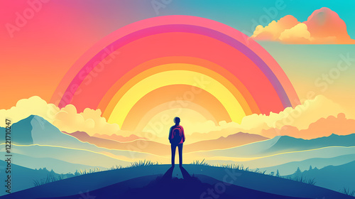 A person standing under a rainbow, symbolizing the promise of hope after a storm, rainbow promise, symbol of hope. Rainbow Valley. Illustration
