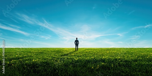 A Person Stands Alone in a Vast Green Field Under a Clear Sky